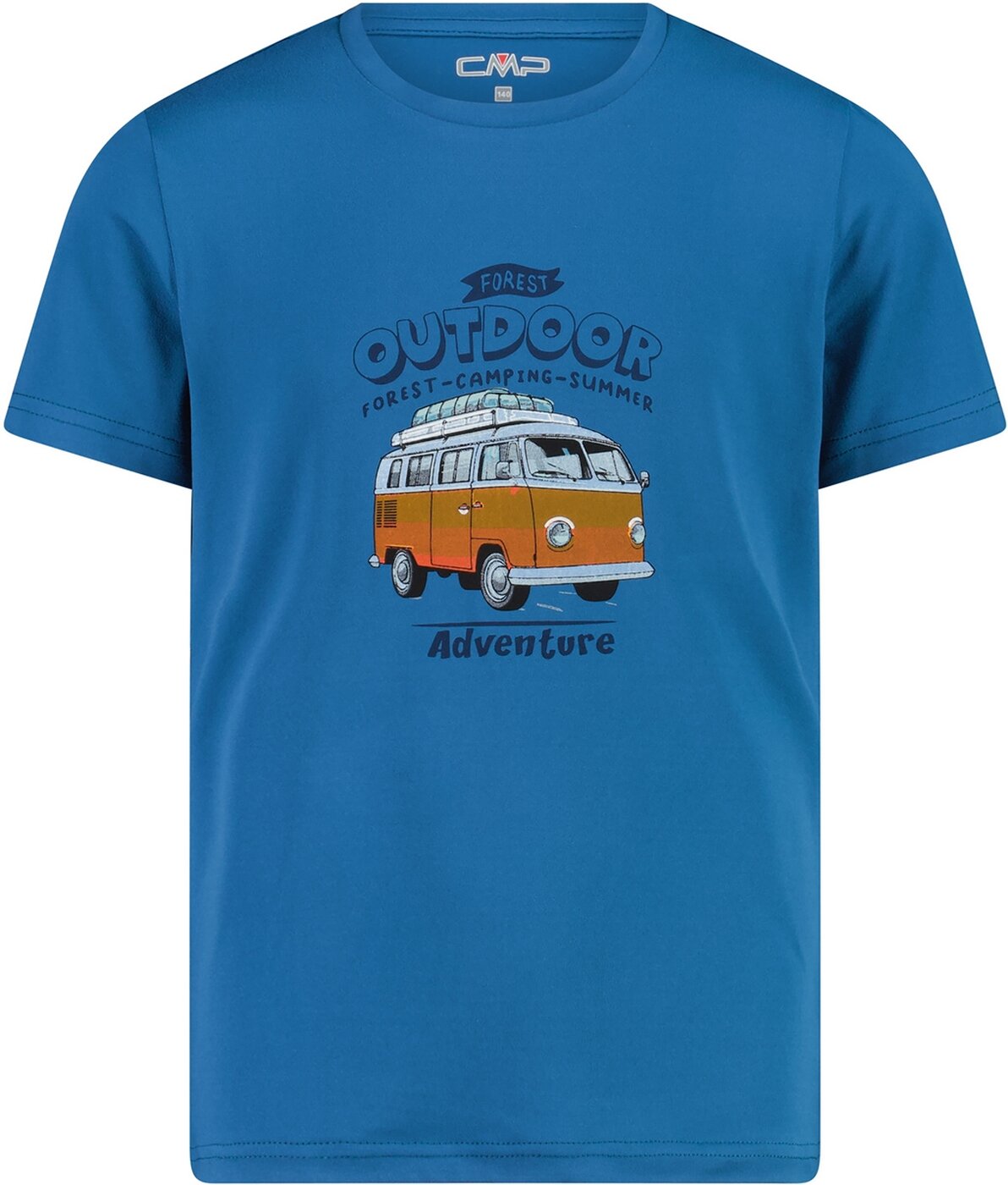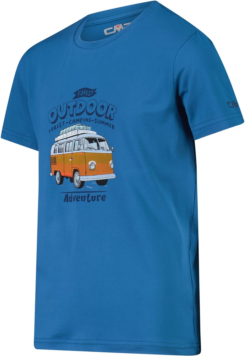 Kinder-T-Shirt aus Stretch-Jersey, in lebhaften Farben und mit einem Aufdruck, der an Camping und Abenteuer erinnert. Ein multifunktionales Kleidungsstück für Schule und Freizeit in der schönen Jahreszeit. Material: 92% Polyester 8% Elasthan