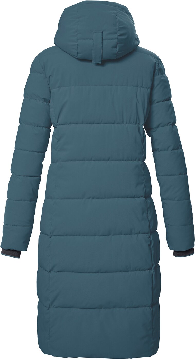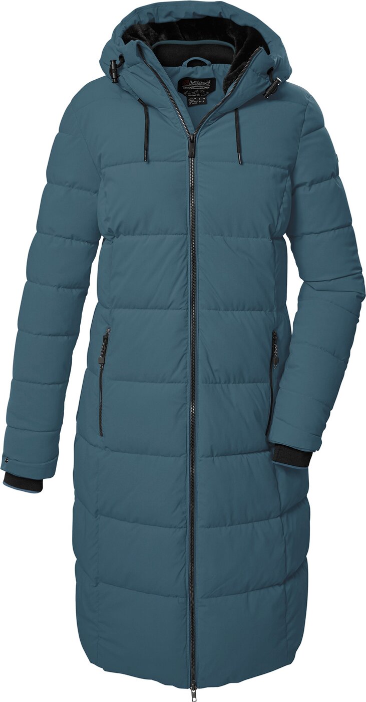 Der lange Damen Wintermantel in Daunenoptik begleitet zuverlässig durch die kältere Jahreszeit. Der Mantel ist winddicht und wasserabweisend mit einer 10.000 mm Wassersäule. Gleichzeitig ist er atmungsaktiv mit einer Wasserdampfdurchlässigkeit von 3.000 g/m²/24 h. Die weich gefütterte Kapuze lässt sich regulieren und schützt vor Kälte und Wind. Der 2-Wege-Reißverschluss ist mit einem praktischen Kinnschutz versehen. An den verstellbaren Ärmelabschlüssen befinden sich bequeme Strickbündchen. Zwei seitliche Zipper-Taschen sowie eine Innentasche bieten ausreichend Stauraum für alle wichtigen Dinge. killtec liegt es besonders am Herzen, die Kollektionen nachhaltiger und zukunftsfähiger zu machen. So setzt killtec verstärkt auf verantwortungsbewusstere Herstellungsverfahren. Dieser Wintermantel wurde daher PFAS-frei imprägniert und teilweise aus recyceltem Material hergestellt. Material: Oberstoff: 100% Polyester, Futter: 100% Polyester, Wattierung: 100% Polyester (recycelt)